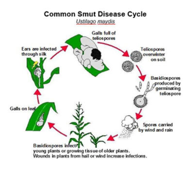 Der Pilz überdauert circa 6 – 10 Jahre an Pflanzenresten oder im Boden in Form von Teliosporen. Auch am Korn können Sporen haften. Die Verbreitung auf den Feldern erfolgt in der Regel über Wind und Regen. Bei höheren Temperaturen und genügend Feuchtigkeit keimen die diploiden Teliosporen und bilden über die Meiose haploide Basidiosporen. Diese ernähren sich nur saprophytisch. Sind die Umweltbedingungen gut und finden sich passende andere Basidiosporen, verschmelzen diese und bilden Infektionshyphen, die über ein sogenanntes Appressorium in verletztes, wachsendes (also meristematisches) Gewebe bzw. die Zellen eindringen können. In der Pflanze induziert der Pilz dann ein verstärktes Zellwachstum und eine Vergrößerung der Zellen. Die normale Entwicklung des Pflanzengewebes stoppt. In diesem Tumor wächst er zunächst zwischen den Zellen und bildet die halb durchsichtig erscheinende Haut der Beulen. Dann dringt er in die vergrößerten Zellen ein, die daraufhin absterben. Er ernährt sich vom Zellinhalt und produziert Massen von neuen Teliosporen. 10 – 14 Tage nach der Infektion werden die Gallen sichtbar. 21 – 23 Tage nach Infektion sind die neuen Teliosporen reif. Die Beulen platzen auf, die innere schwarze Sporenmasse trocknet und verbreitet sich erneut mit Wind und Regen. In einer Galle sind bis zu 200 Milliarden Sporen. Im Laufe der Vegetationsperiode können so bei günstigen Bedingungen für die Sporen weitere Teile der Pflanzen infiziert werden.