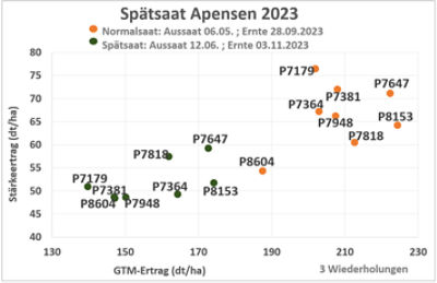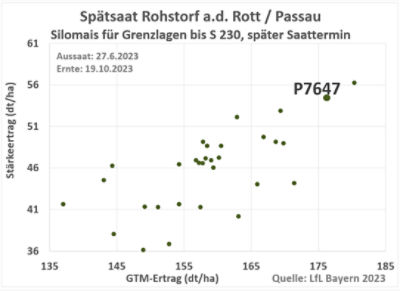 Im jährlichen Pioneer-Spätsaatversuch in Apensen werden beide Aussaattermine im Mittel der Sorten bei gleichem TM-Gehalt, gleicher Wärmesumme und gleichem Stärkegehalt geerntet. Der Hauptunterschied zwischen Normalsaat und Spätsaat liegt bei diesen Gegebenheiten im Gesamttrockenmasseertrag. Im kalten Mai und Frühsommer 2023 konnte die früheste Sorte zum Normaltermin den höchsten Stärkeertrag bilden. Unter den wärmeren Bedingungen zur Spätsaat und im Oktober 2023 zur Kornfüllung konnte die Sorten P7818 ihre Platzierung im Stärke- und GTM-Ertrag im Vergleich zur Aussaat unter den kühlen Bedingungen von Platz 7 auf Platz 2 verbessern. Sie empfiehlt sich für Spätsaaten auf warmen Lagen mit gutem Herbstwetter. Auf die raueren Lagen passen frühere Sorten mit besserer Jugendentwicklung. P7647 ist optimal für alle Spätsaaten geeignet.