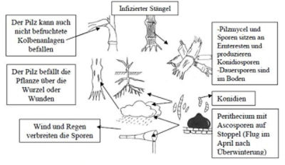 cm kleinräumig im Bestand verteilt werden. Theoretisch kann die Infektion auch über das Saatkorn erfolgen. Die bei uns übliche Fungizidbeizung schließt dieses jedoch aus.