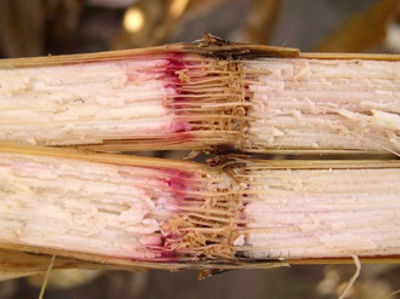 Eine Pflanze kann von mehreren Pilzarten gleichzeitig befallen sein. Sie kann im Wurzel- und Kronenwurzelbereich Myzel F. graminearum und im Internodium darüber eine Infektion mit F. culmorum aufweisen. Der Unterschied ist über die Innenfärbung des befallenen Stängels festzustellen: