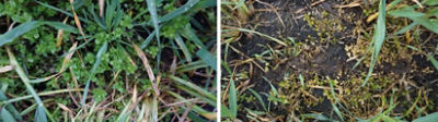 Til venstre ses resistent fuglegræs som er behandlet med en SU-løsning. Effekten udebliver totalt. Til højre ses effekten af Rexade 440 som bekæmper denne type af resistent fuglegræs med fuld effekt.