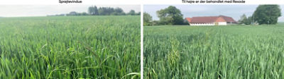 Til venstre ses et sprøjtevindue i en mark som her behandlet med 50 gram Rexade + 0,3 Atlantis. Den behandlede del af marken hel ren. Til højre ses et billede taget i kanten af sprøjtevinduet til venstre og den behandlede mark til højre.