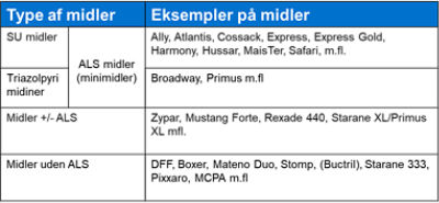 Når man taler om resistent bredbladet ukrudt, taler man om ALS-resistent ukrudt navngivet efter midlernes virkningssted i planten. Desværre er det denne gruppe af midler, hvorpå hovedparten af specielt forårsindsatsen er baseret. ALS-gruppen består af 2 undergrupper kaldet minimidler (SU) og triazolpyrimidiner. Denne underdeling er af stor betydning for, hvilken effekt man vil opleve i marken. Til gruppen af minimidler hører Express™, Ally™, Hussar™, Cossack™ mfl. Efter gentagne sprøjtninger med disse midler udvikles der med al sandsynlighed resistens i marken og denne resistens betegnes SU-resistens. Mod SU-resistent ukrudt virker triazolpyrimidinerne stadig og derfor vil man opleve, at Primus™ (florasulam) stadig kan bekæmpe SU-resistent ukrudt, selvom Primus i sig selv er ALS-kemi. Efter gentagne behandlinger med Primus, vil der med stor sandsynlighed også udvikles resistens over for Primus og resistenstypen betegnes ALS-resistens. Mod denne type af resistent ukrudt skal der ses på løsninger som indeholder noget andet end ALS-kemi.
