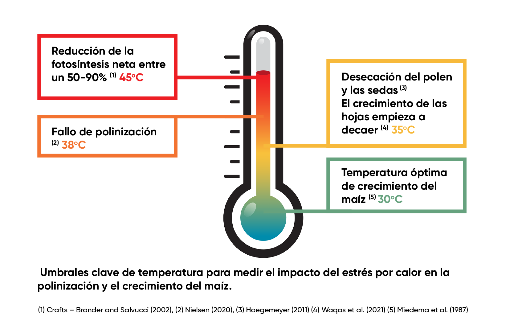 En realidad, el estrés por calor va casi siempre asociado a estrés hídrico, y resulta complicado separar el efecto de la temperatura o de la falta de agua en el crecimiento y desarrollo del maíz en cualquiera de sus estadios de crecimiento. Hay cierta unanimidad entre los investigadores en considerar que el principal impacto de las altas temperaturas sobre el cultivo se debe a que estas intensifican la falta de disponibilidad de agua para la planta.