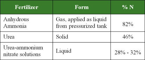 Aunque existen varias formas de fertilizantes de nitrógeno diferentes, como el sulfato de amonio, el nitrato de calcio y el fosfato diamónico, más del 80 % de las necesidades de nitrógeno del maíz en Norteamérica se satisfacen con soluciones de amonio anhidro, de urea y de UAN.