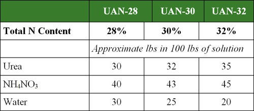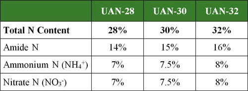 Tal y como muestra la Tabla 3, la mitad del total de nitrógeno en las soluciones de UAN es nitrógeno de amida (NH2-) derivado de la urea: un cuarto es nitrógeno de amonio (NH4+) derivado del nitrato de amonio y un cuarto es nitrógeno de nitrato (NO3-) derivado del nitrato de amonio.