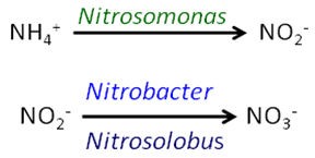 Las reacciones del suelo - Con el tiempo y con temperaturas apropiadas del suelo que soporten la actividad biológica, los iones de NH4+ se convierten en forma de nitrato (NO3-) mediante la acción de bacterias específicas del suelo en un proceso conocido como nitrificación. En general, la nitrificación se produce con temperaturas del suelo por encima de los 10 ºC grados, y aumenta a medida que la temperatura aumenta por encima de este nivel. Sin embargo, cierta actividad limitada también se produce por debajo de los 10 ºC. El amonio primero se convierte en nitritos (NO2-) mediante la acción de las bacterias Nitrosomonas y después en nitrato por las bacterias Nitrobacter y Nitrosolobus: