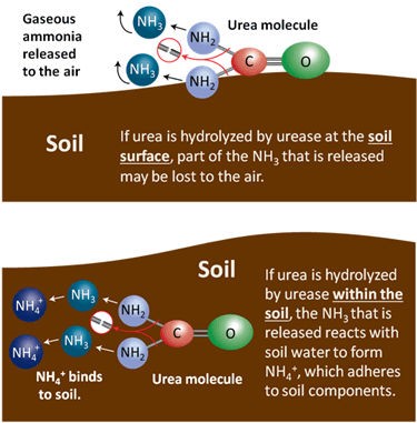 Para que el nitrógeno en la urea esté disponible para las plantas, debe producirse una reacción química que transforme los grupos amidas de la molécula urea en amoníaco (NH3). Esta enzima de la ureasa, extendida por los suelos, cataliza esta reacción de hidrólisis. Si el proceso se produce en la superficie del suelo, el amoníaco gaseoso puede perderse rápidamente en el aire. Sin embargo, si esta reacción se retrasa hasta que la urea aplicada en la superficie se incorpore al suelo por labranza, precipitaciones o irrigación, el riesgo de pérdida de amoníaco se reduce significativamente.