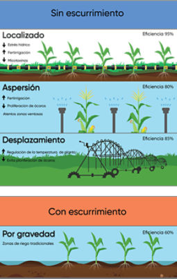 En el cultivo del maíz generalmente se utilizan tres sistemas de riego: por aspersión, localizado y por gravedad.