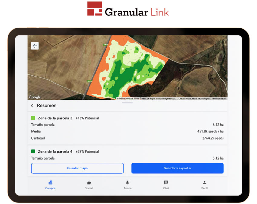 Una vez generada esta zonificación, nuestra calculadora personalizada de siembra le ayuda a establecer de forma automática las cantidades de semilla que se aportarán en cada zona, obteniendo de esta forma un mapa de prescripción fiable y que puede exportar a su maquinaria. Y es este último punto el que realmente cierra el ciclo: con un sólo click, el usuario puede elegir el tipo de máquina y fabricante con el que va a realizar la labor de siembra y trasladarlo a su monitor a bordo sin ningún tipo de conflicto de compatibilidad. Granular Link ofrece compatibilidad con los principales fabricantes de maquinaria, buscando facilitar el día a día y convertir un proceso que llevaba horas de análisis y de trabajo, en uno capaz de ser realizado en menos de 10 minutos a bordo del vehículo.