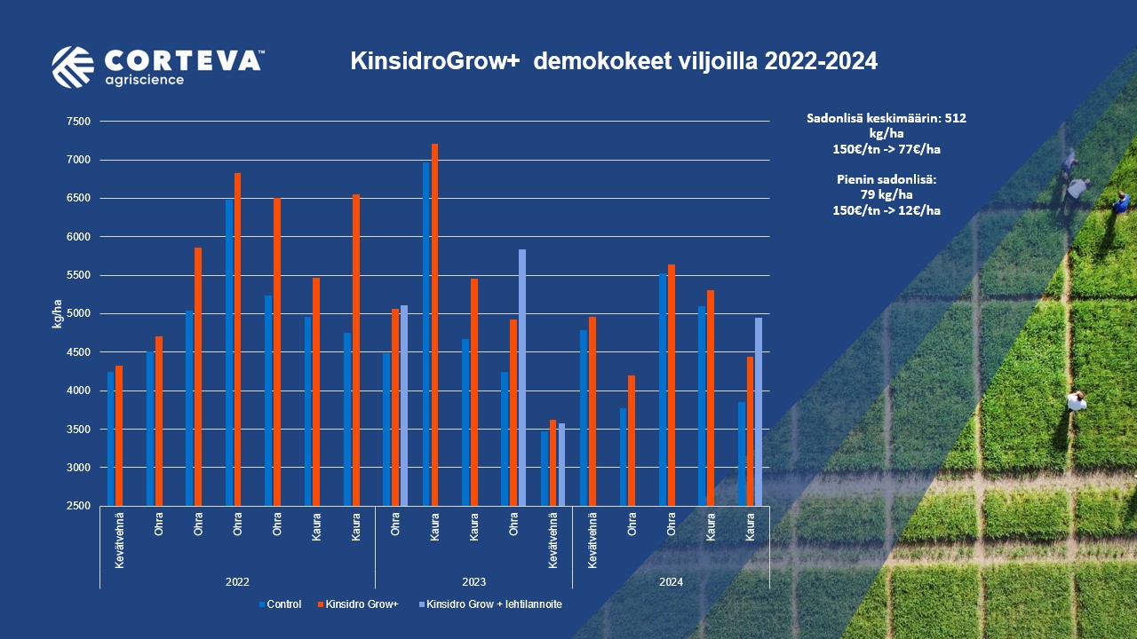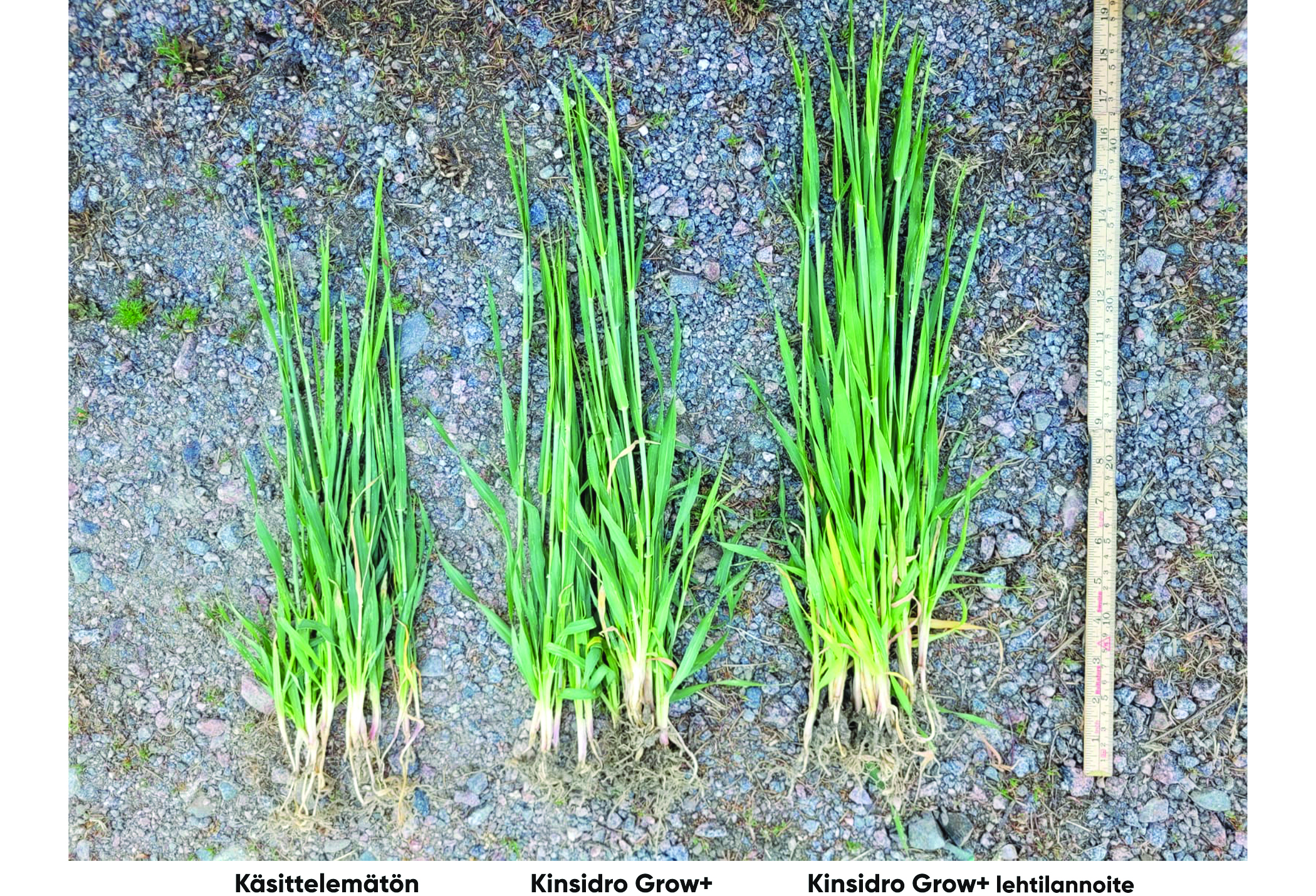 Kinsidro™Grow+ on uusi kasvustoruiskutukseen tarkoitettu biostimulantti viljoille. Se on peräisin havumetsistämme, sillä sen pääraaka-aineena käytetään metsäteollisuuden sivuvirtana syntyvää ligniiniä. Tuote sisältää paljon humus- sekä erityisesti fulvohappoja, jotka tekevät tuotteesta erittäin tehokkaan. Lisäksi siinä on näihin yhdisteisiin sidottuina sekä EDTA kelaattimuodossa tärkeimpiä hivenravinteita. Patentoitu, ainutlaatuinen koostumus vaikuttaa kasvien biologiseen aktiivisuuteen, lisää klorofyllin määrää ja parantaa siten fotosynteesin tehokkuutta sekä stimuloi solujen jakautumista ja kasvua sekä juurien, versojen ja lehtien kehitystä. Kinsidro™Grow+ käsittelyn jälkeen kasvit käyttävät ravinteita tehokkaammin ja kasvavat voimakkaammin, mikä parantaa sadon määrää ja laatua.