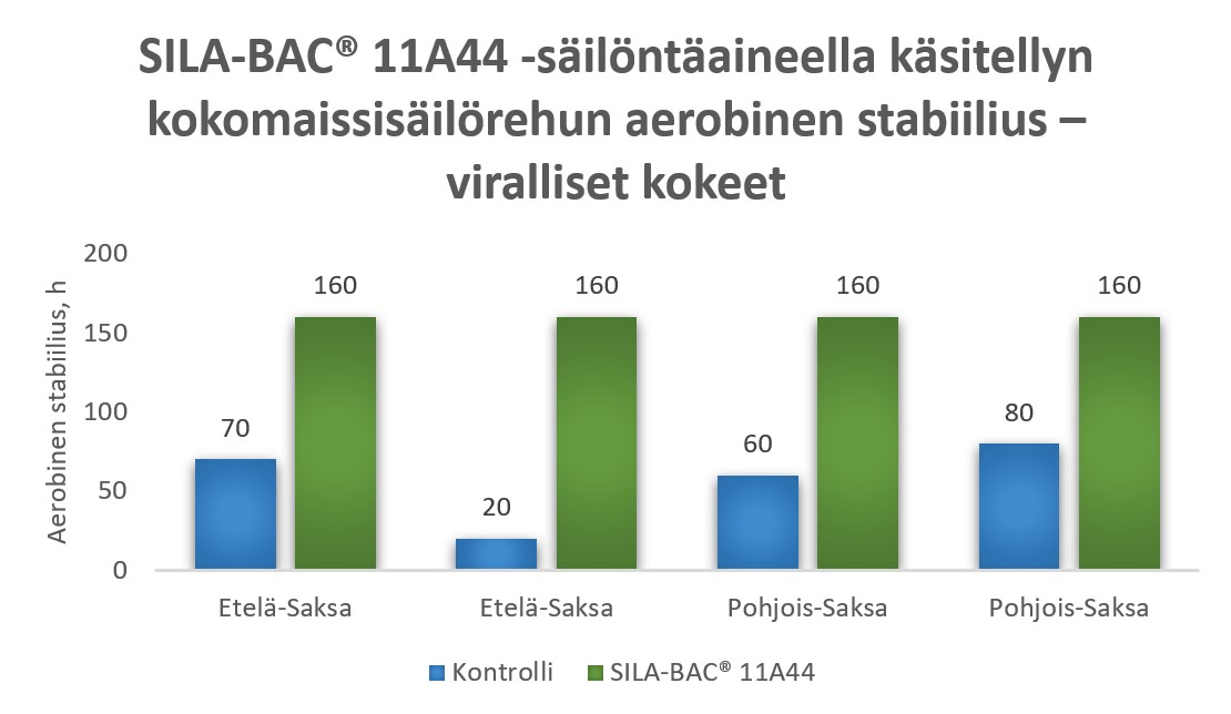 Käsittelemättömiin verrannesäilörehuihin verrattuna SILA-BAC® Stabilizer 11A44 ‑säilöntäaineella käsiteltyjen säilörehujen stabiilius oli vähintään 4 vrk parempi.