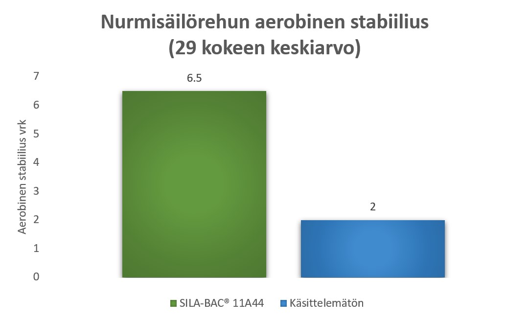 Käsittelemättömiin verrannesäilörehuihin verrattuna SILA-BAC® 11A44 ‑säilöntäaineella käsiteltyjen säilörehujen stabiilius oli vähintään 4 vrk parempi.