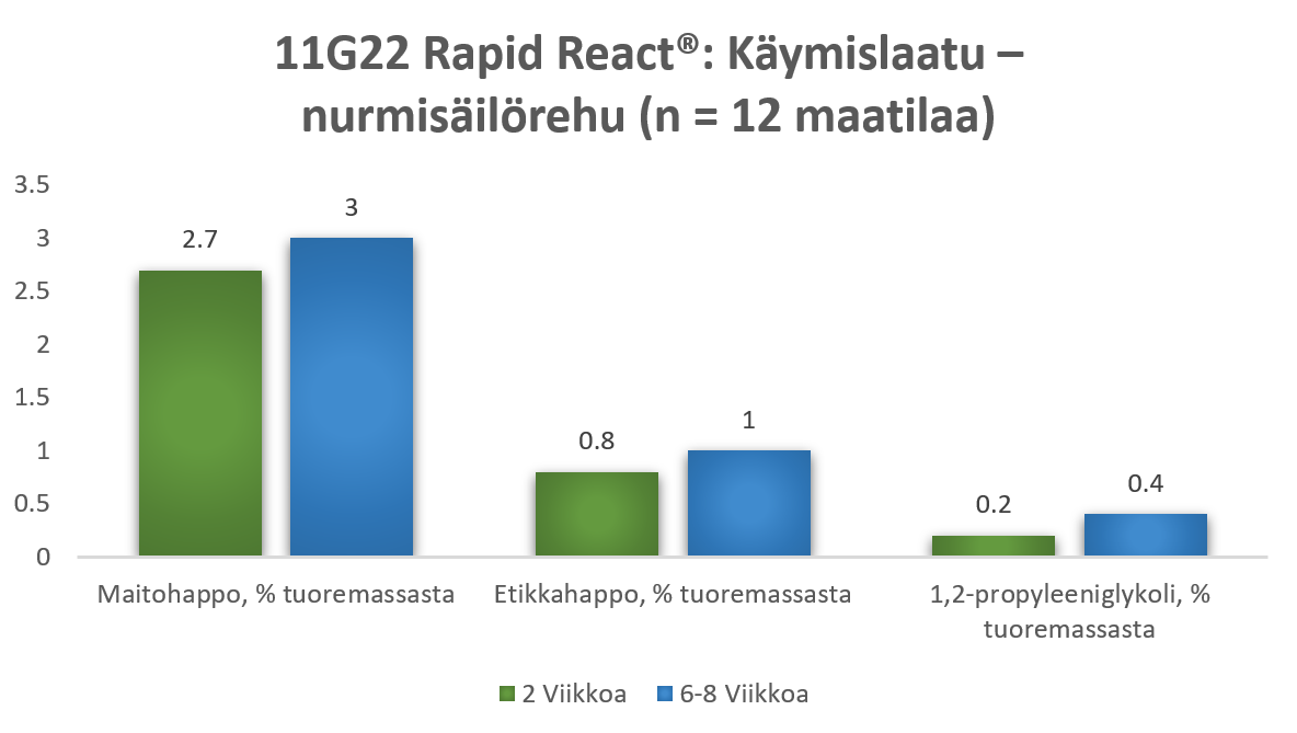 Jo käymisprosessin alkuvaiheessa muodostuu runsaasti maitohappoa, sekä maltillisesti etikkahappoa ja propyleeniglykolia. Varsinkin sopiva etikkahappopitoisuus varmistaa säilyvyyden ja nopeuttaa aerobisen stabiiliuden saavuttamista rehuarvoja sekä syöntiä heikentämättä. Käsittelemättömiin säilörehuihin verrattuna SILA-BAC ®11G22 Rapid React® ‑säilöntäaineella käsiteltyjen säilörehujen etikkahappopitoisuus oli odotetusti suurempi jo lyhyen ajan kuluttua rehunteosta.