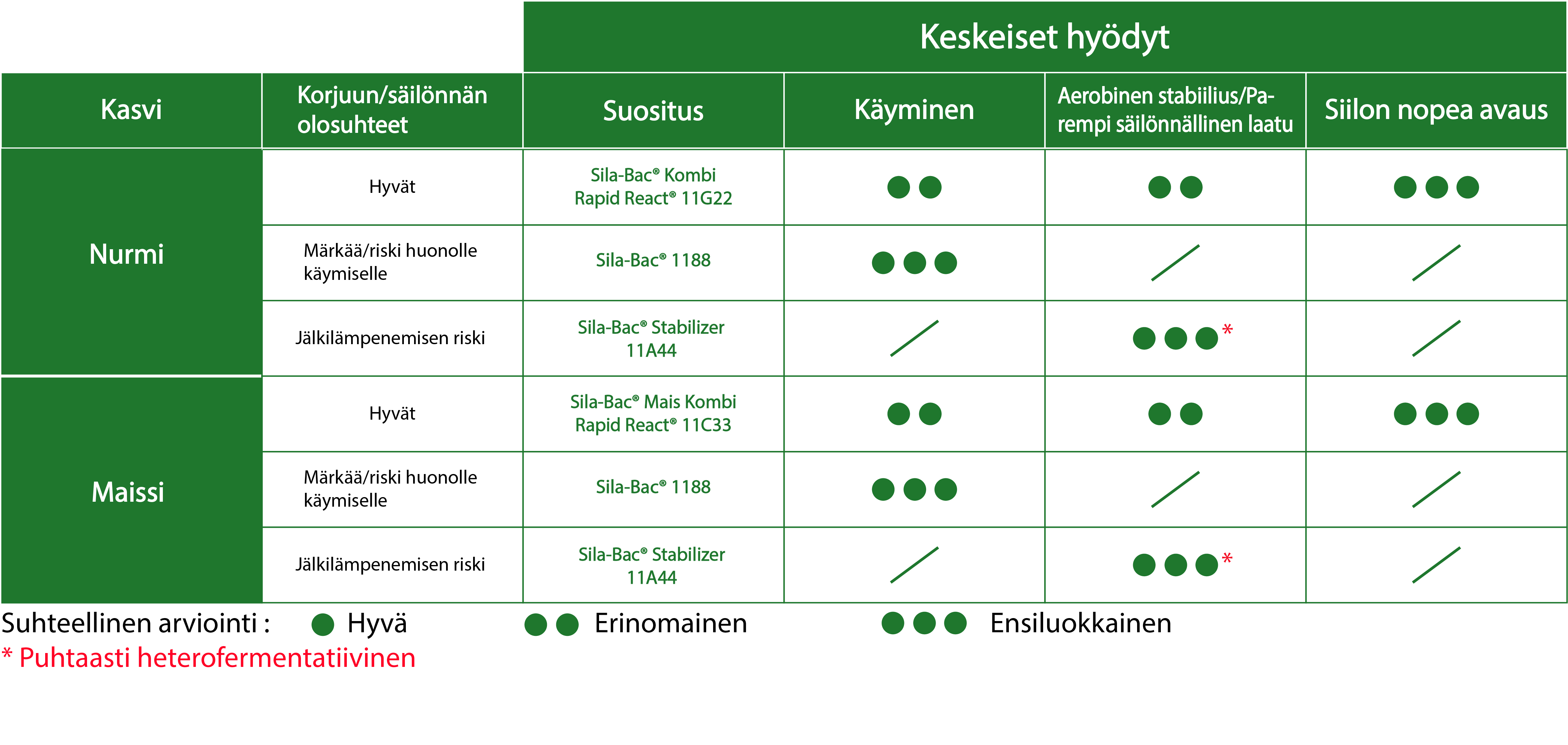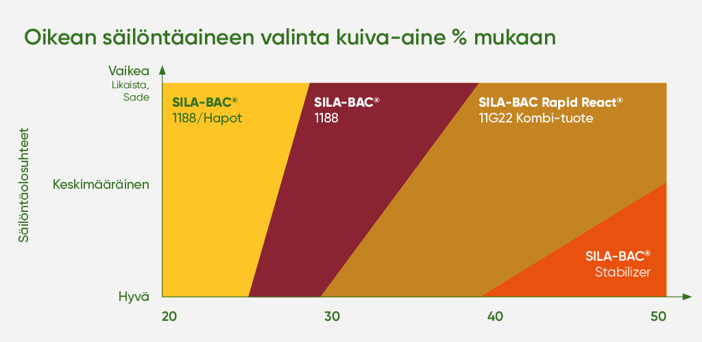 - Mikäli SILA-BAC® tuotteiden annosteluohjeita noudatetaan niin käyttömäärällä saadaan 100.000 lisääntyvää yksikköä bakteeria per gramma tuoretta säilörehua maailmanlaajuisten standardien mukaan