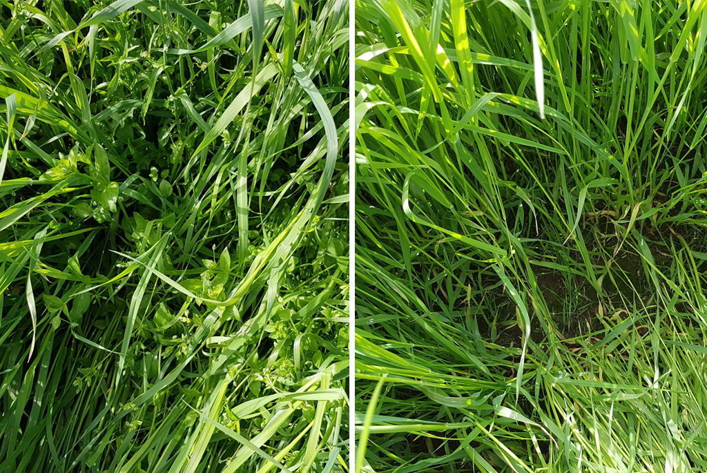 Rikkakasveista vapaa nurmi takaa laadukkaan säilörehun ja vähentää nurmien uusimisen tarvetta. Oikealla Primus XL 1,0 l/ha ruiskutettuna 20.5.2019 Kannuksessa ja vasemmalla käsittelemätön kohta samalta lohkolta.