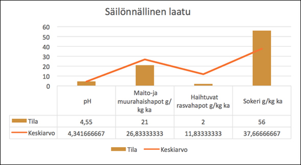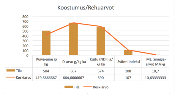 Säilörehu oli korkeasta kuiva-ainepitoisuudesta huolimatta hyvin säilynyt ja ruokinnalliset arvot olivat melko optimaalisia. Haitallisia käymistuotteita ei ollut syntynyt säilöntäprosessin aikana, mikä voitiin vahvistaa myös rehun aistinvaraisella arviolla. Rehu oli hyvän tuoksuista ja varmasti maittavaa lehmille.