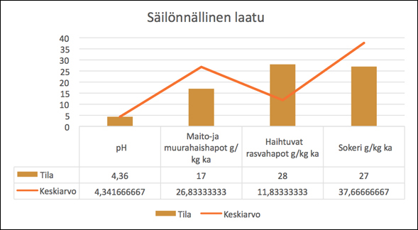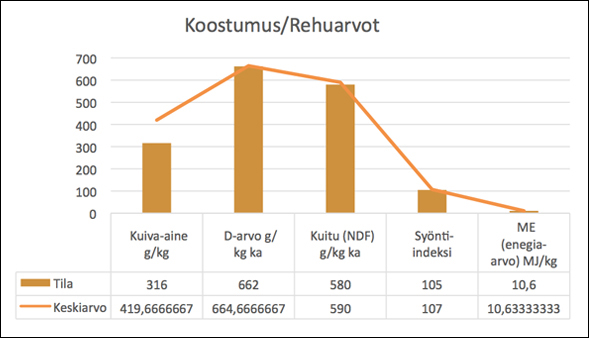 Analyysien ja aistinvaraisen arvion perusteella rehu oli hyvänlaatuista ja säilöntä oli onnistunut hyvin. PH:n lasku oli ollut riittävä ja käymistuotteiden perusteella virhekäymistä ei ollut tapahtunut. Sokeripitoisuus oli pysynyt riittävällä tasolla ja rehu oli koostumuksenkin puolesta helppoa syöttää eläimille.