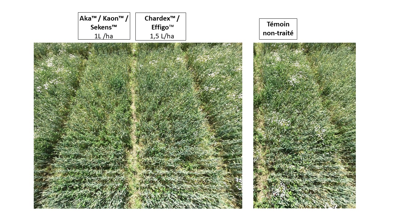 Description avec objectif de l’essai : Dans cet essai, nous souhaitons déterminer l’efficacité dicotylédones des produits Aka™ / Kaon™/ Sekens™ et Chardex™/ Effigo™