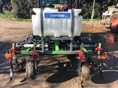 GrifHerbi se présente sous forme d’un kit à adapter à votre matériel existant. Ce kit est constitué d’une cuve de 100 L et d’un système de buses que le viticulteur installe sur son outil de travail du sol. Des essais conduits par Corteva en 2020 ont montré une meilleure efficacité de l’herbicide anti-germinatif lorsqu’il est appliqué après le travail du sol plutôt qu’avant.