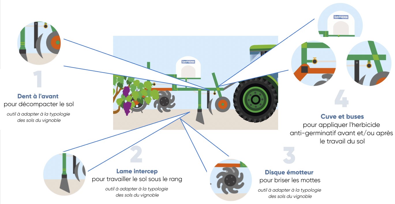 GrifHerbi est un concept de désherbage associant le travail mécanique à l’application de produits anti-germinatifs visant à contrôler les adventices en vigne. La partie mécanique détruit la flore présente et la partie chimique empêche la germination de nouvelles adventices.