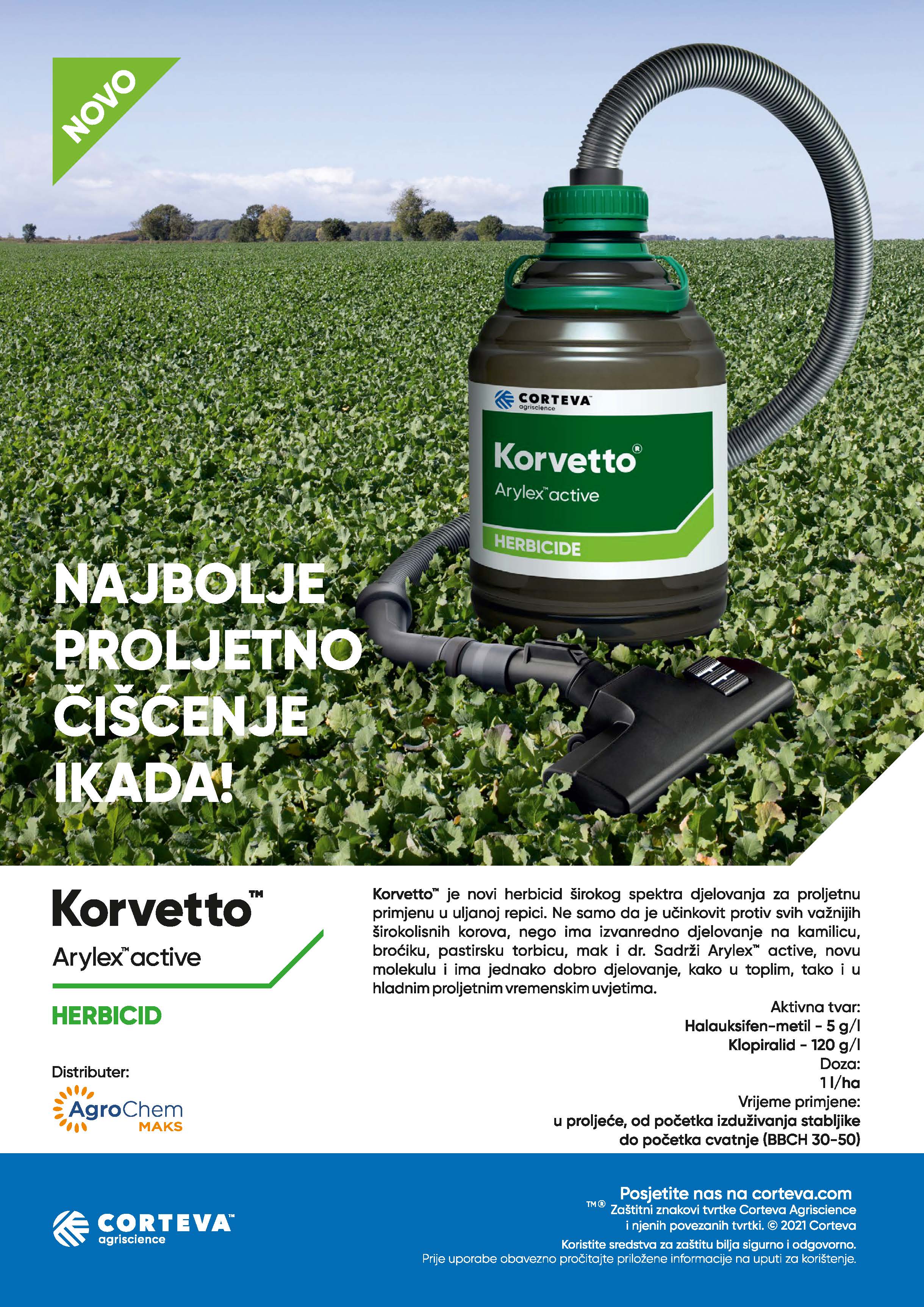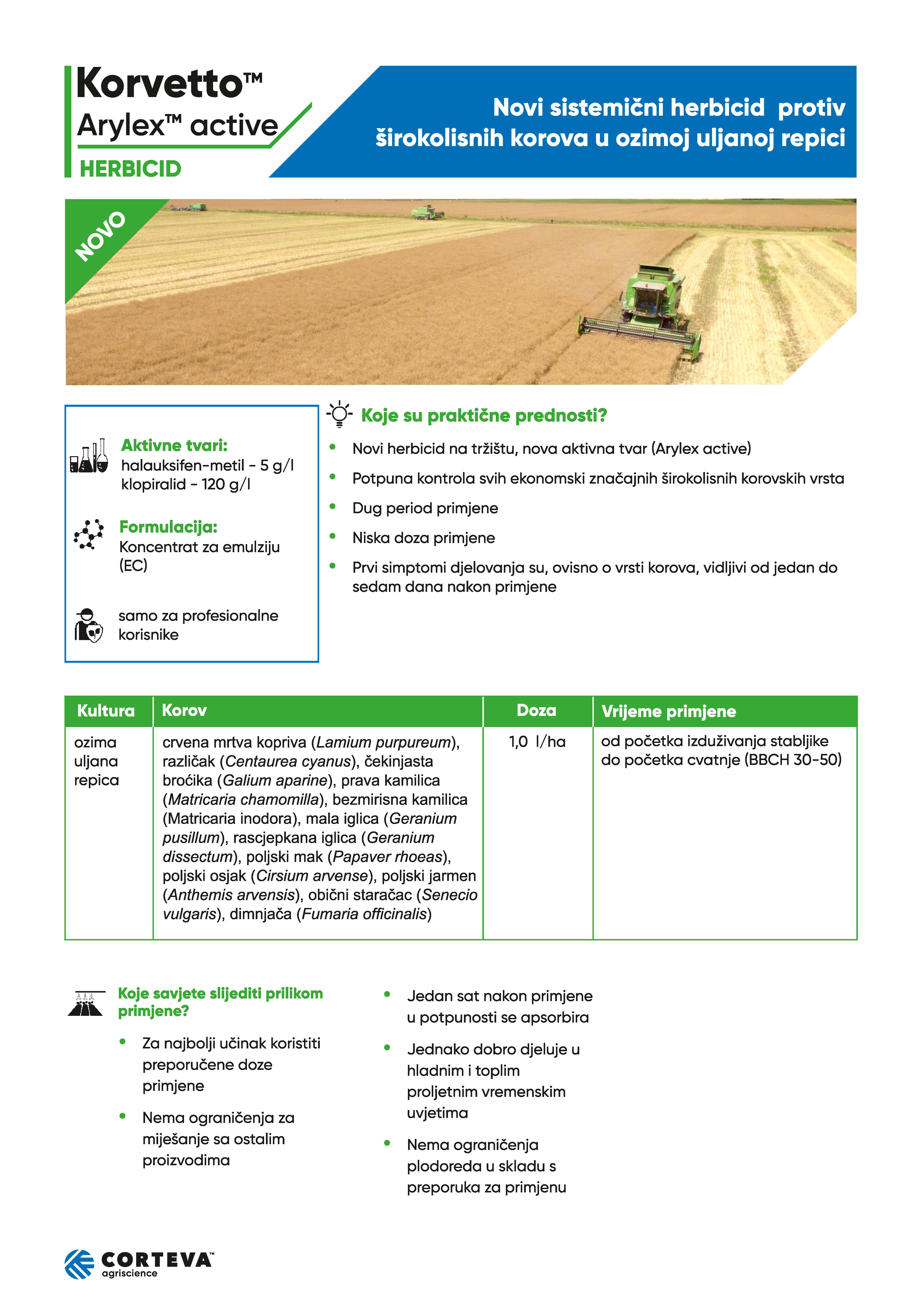 U periodu kad uljana repica uđe u fazu zimskog mirovanja često se desi da toplo i kišovito vrijeme iznimno pogoduje rastu i razvoju jesensko-zimskim korova no od ovog prolječa poljoprivredni proizvođači uljane repice mogu se osloniti na potpuno novi herbicid tvrtke Corteva Agriscience™ koji dolazi pod trgovačkim nazivom Korvetto™.