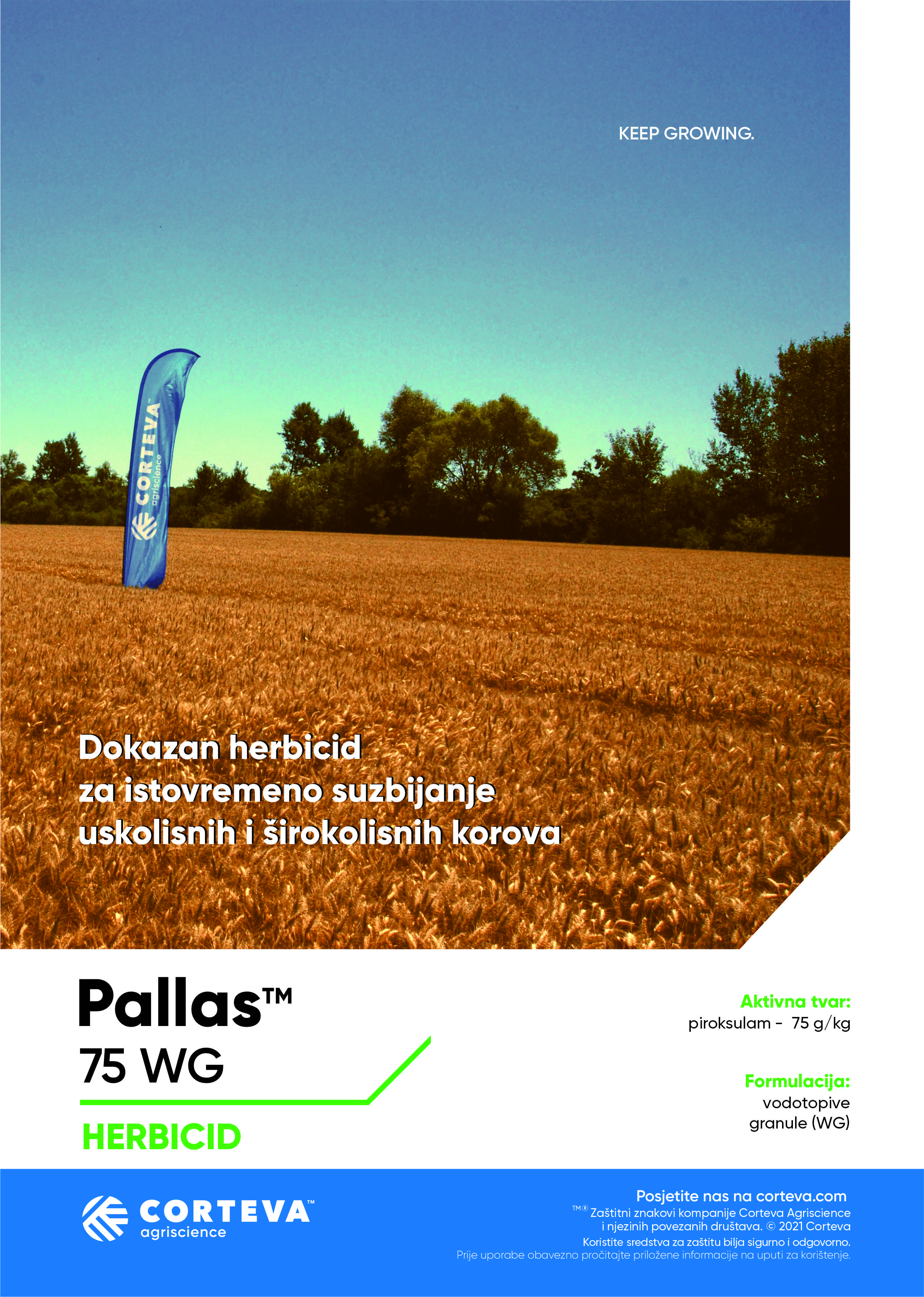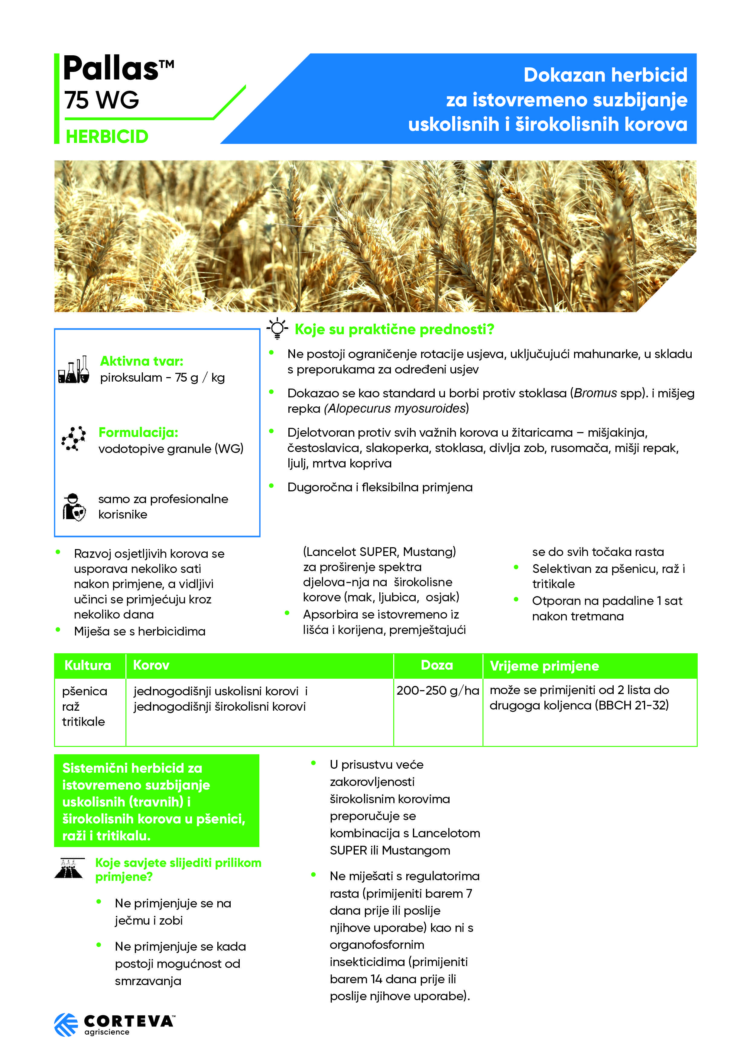 PALLAS™ 75 WG je sada već provjereni i zasigurno najučinkovitiji post-em sistemični herbicid za suzbijanje svih ekonomski značajnih travnih i određenih širokolisnih korova u pšenici, raži i tritikalu.