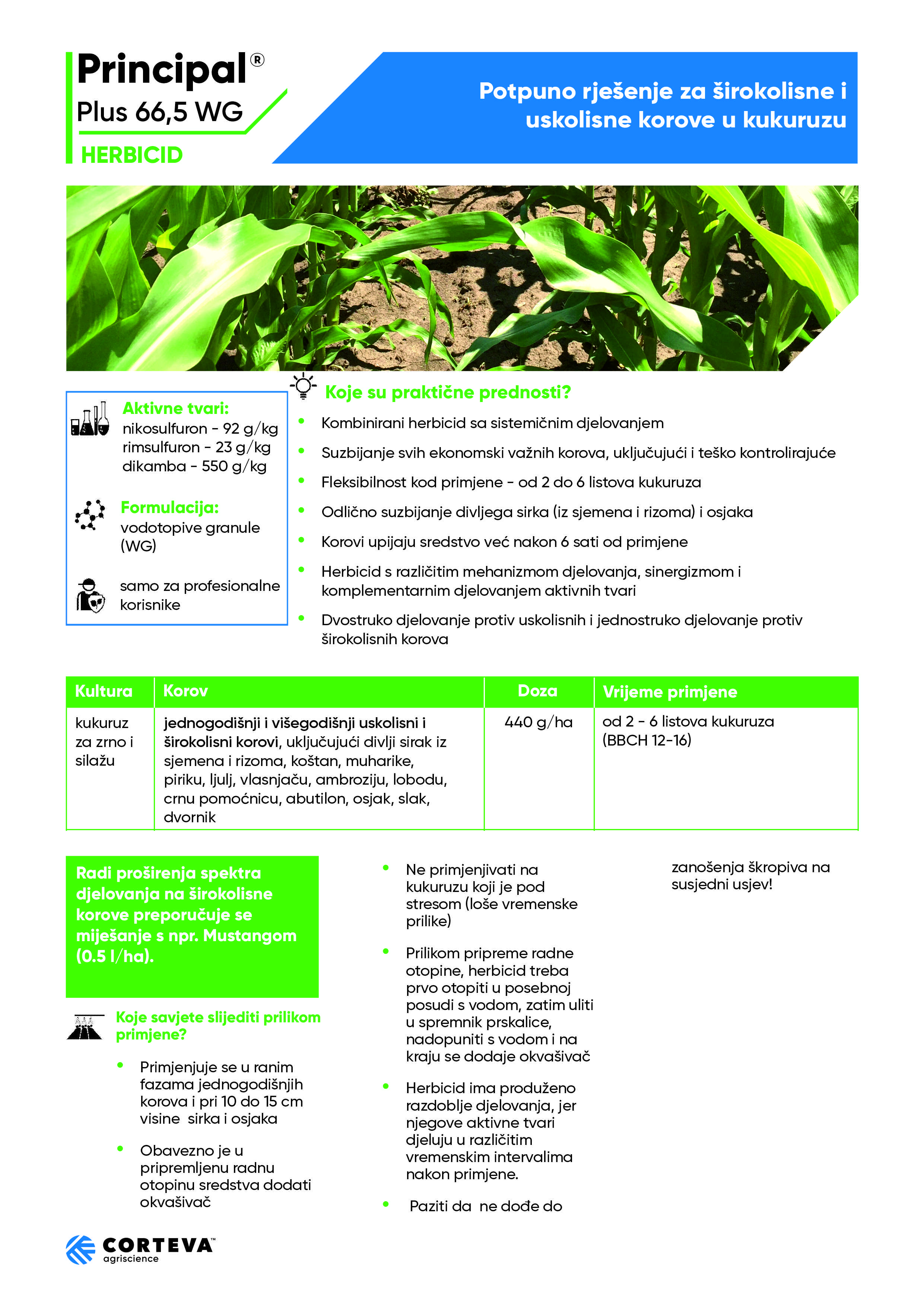 Dakle, odabirom kvalitetne zaštite od korova, kukuruzu će te osigurati nesmetani prostor i maksimalno iskorištenje dostupnih hranjiva, visoke prinose i profitabilnost proizvodnje, a to je moguće samo uz Principal Plus 66,5 WG.