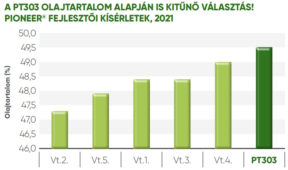 A PT303 közép-késői érésidejű, magas hibridben pedig minden benne van, ami támogatja a hatékony termelést: kimagasló termoképesség, kiváló olajtartalom és betegség elleni tolerancia.