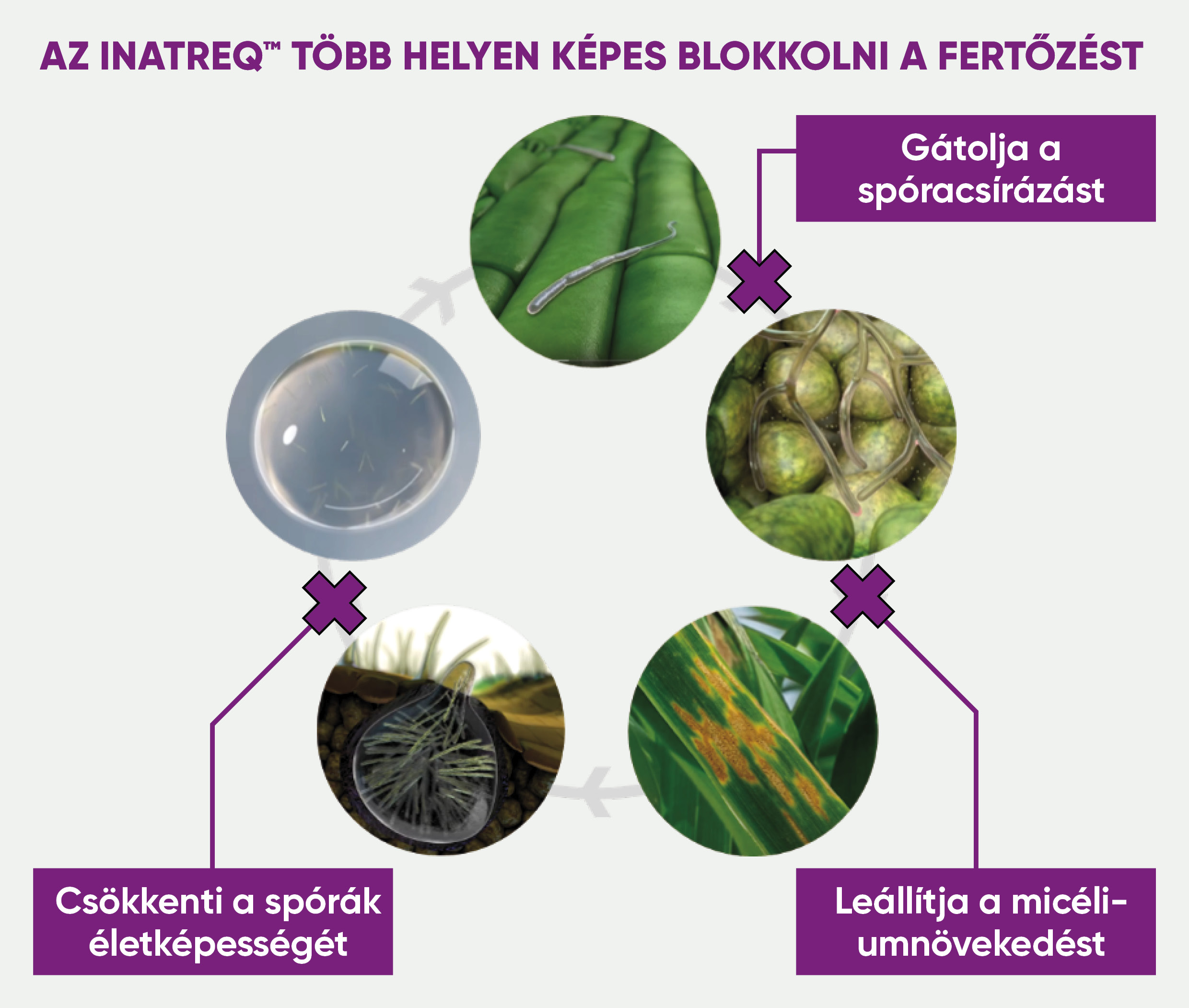 A növényben már esetlegesen kialakult gomba szaporítóképletekben termelődő spórák életképessége drasztikusan csökken az Inatreq™ jelenlétében, a betegségek továbbterjedésének akadályozásával egészül ki a komplex gombaölő hatás. Az Inatreq™ teljesítve korunk elvárásait erős biológiai hatásával, a rezisztencia kezelésével és hosszú hatástartamával rövidesen minden gabonatermesztő rendelkezésére áll az új termékben.