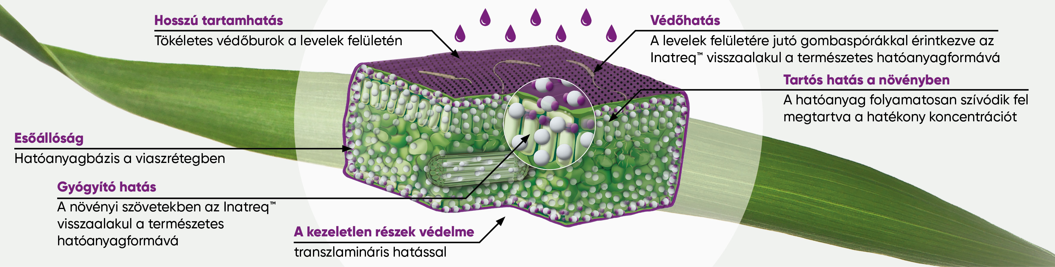 Az Inatreq™ azonban nem csak a felszínen véd, hanem fel is szívódik a növényi szövetekbe és ott csúcsirányban mozogni képes. A felszívódás folyamatosan zajlik, eredményeként biológiailag aktív hatóanyagmennyiség kerül a növényi szervezetbe. A kezeletlenül maradt növényi részek védelme is megvalósul a szisztémikus tulajdonság révén. A permetezés időpontjára már bekövetkezett fertőzések eredményeként a növényi szövetekbe bejutott gombafonalak felveszik a hatóanyagot, növekedésük megáll, majd elpusztulnak, így érvényesül az Inatreq™ gyógyító hatása. Az élő szövetekben az Inatreq™ visszaalakul a természetes aktív vegyületté és rendkívül gyorsan blokkolja a fertőzést.