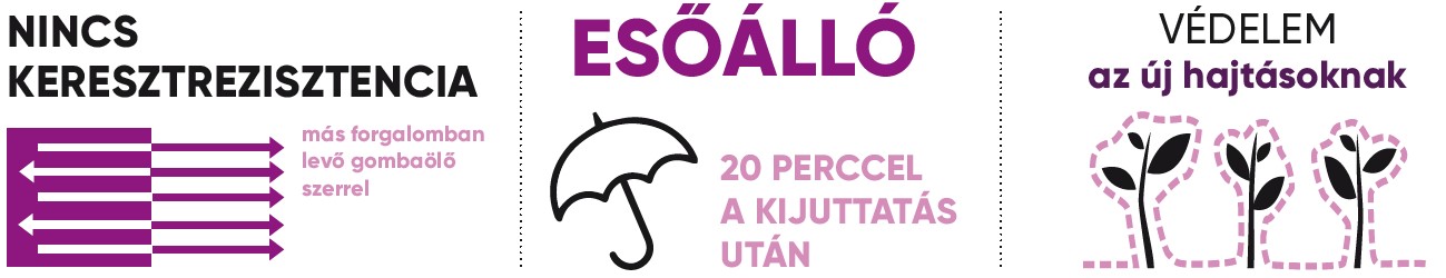 A kijuttatást követően gyorsan elmozdul a növény felszínéről a mélyebb szövetrétegek felé, bejut a viaszos kutikulába, a csapadék már nem befolyásolja hatékonyságát. Így egy eddig nem tapasztalt 20 perces esőállóságot mutat fel, amivel kiemelkedik a versenytársak közül, extrém csapadékviszonyok között is biztosítja a szőlő védelmét!