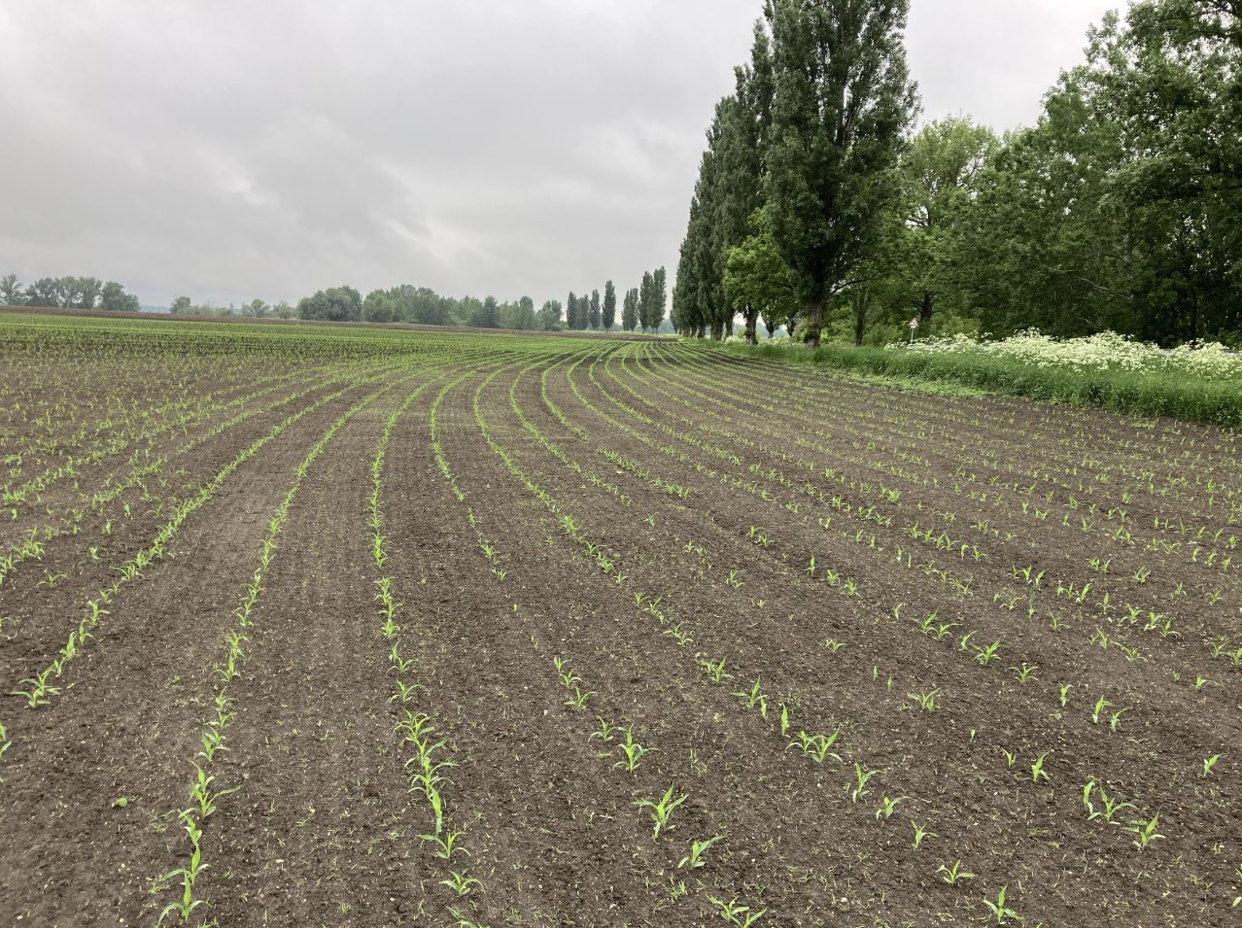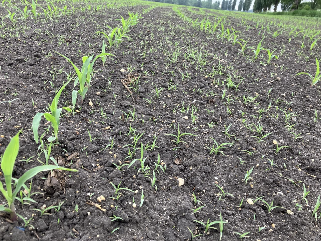 Kakaslábfű tömeges csírázása a kukorica 2-3 leveles fejlettségében. Nemesgörzsöny, 2025