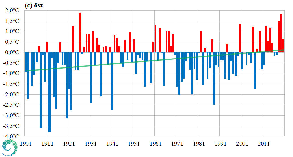 Az Országos Meteorológiai Szolgálat adatai alapján 1901 és 2020 között az országos éves középhőmérséklet 1,2°C-kal emelkedett (1. ábra). Az őszi évszakot kiemelve, a teljes 120 év alatt 1°C, az elmúlt 40 év során (1980-2020) pedig 1,5 °C emelkedést mértek (2. ábra). A közelmúltban a melegedés mértéke tehát nagyobb volt, mint a teljes 120 év során. A fagyos napok számának csökkenése szintén a melegedő tendenciát jelzi.