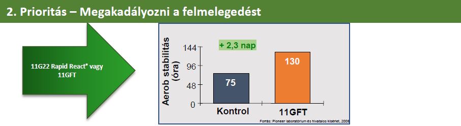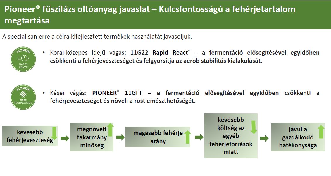 Használjon homofermentív és heterofermentív baktériumokat tartalmazó Pioneer® oltóanyagokat. A homofermentív út két szempontból fontos elsősorban gyors pH csökkenést eredményez ezáltal kevesebb a fehérjeveszteség így pedig értelemszerűen több fehérje jut a napi takarmányadagba. Másodsorban pedig megnöveli a tejsavas baktériumok mennyiségét (amely jellemzően relatíve alacsony kora tavasszal), így csökkentve a vajsavas erjedés és rossz íz esélyét