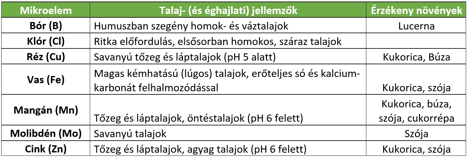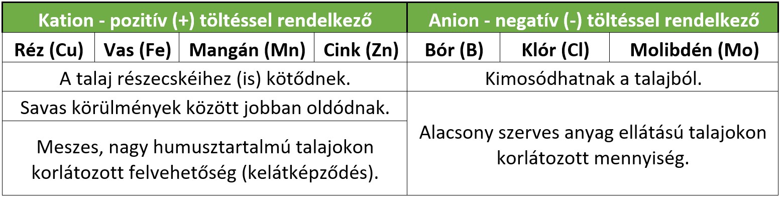 Egy szántóföldi növénynek élete során 16 nélkülözhetetlen kémiai vegyületre van szüksége, hogy fejlődhessen (köztük a vízre H2O és CO2-ra is). A korábbi bekezdésben felsorolt 7 nyomelem mennyisége a legtöbb talajban elegendő kellene, hogy legyen a növények igényeinek kiszolgálásához. Azonban főként a homokos, humuszban és szerves anyagban szegény talajokon sokszor előfordulhat hiánytünet, míg más területeken a szélsőséges pH értékek befolyásolhatják a felvehetőséget. A mikroelemek alapvető kémiai tulajdonságai határozzák meg a talajból történő felvehetőségüket.