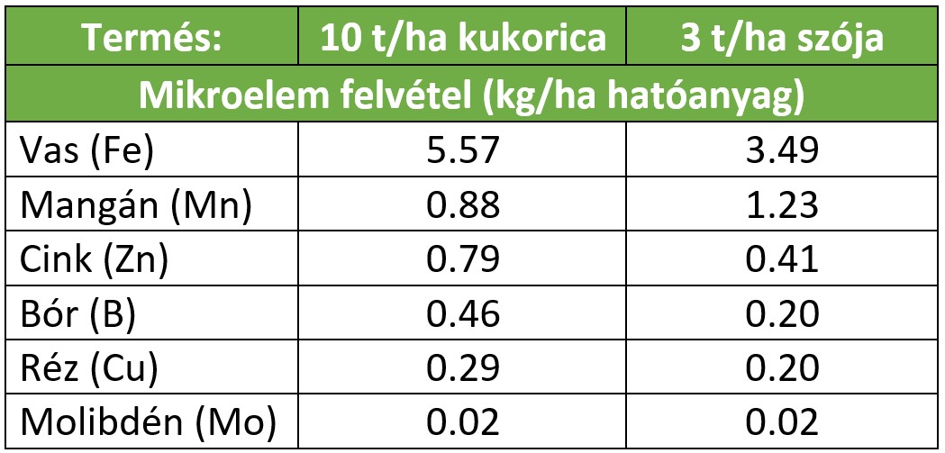 A 2. táblázatban láthatók 10 t/ha-os szemes kukorica, illetve 3 t/ha-os szója kultúra betakarítása során a területről eltávolított mikroelem mennyiségek.