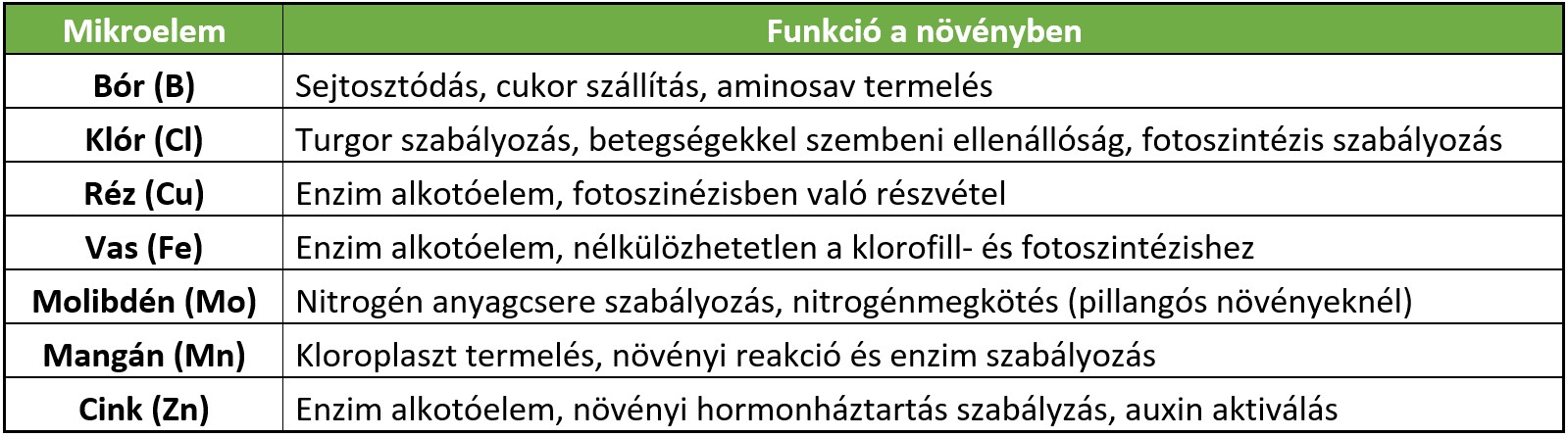 3. táblázat: Mikroelemek funkciói a növényekben