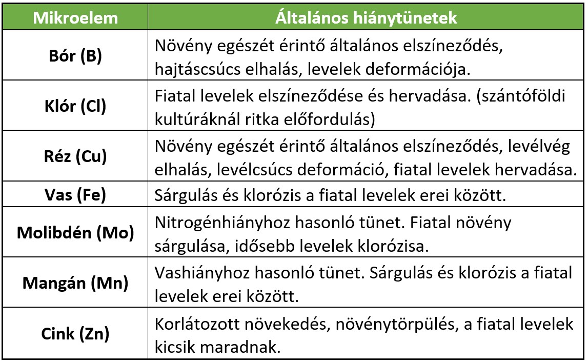 4. táblázat: Általános mikroelem-hiánytünetek