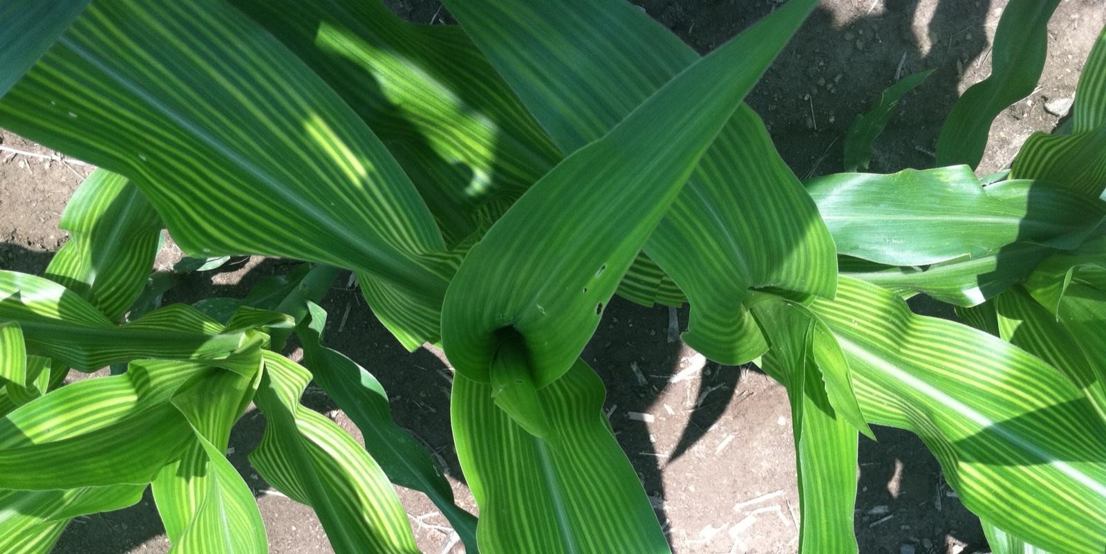 3. ábra: Kukoricában vas és a cink hiánya is okozhat ilyen tüneteket. Ahhoz, hogy pontosan kiderítsük melyik a kettő közül, szükségünk lesz kiegészítő talaj- vagy szövetvizsgálatra.