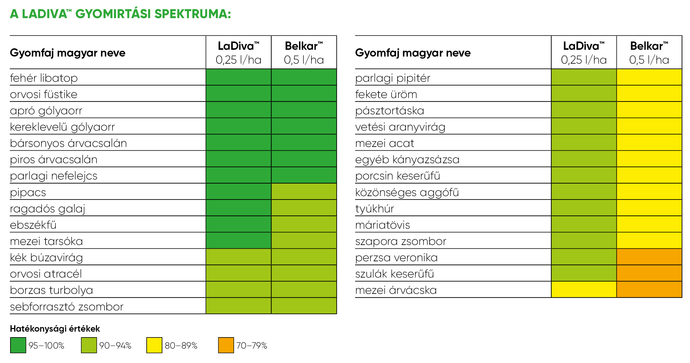 A LaDiva™ egy termékben ötvözi a levélen- és gyökéren keresztüli hatást úgy, hogy közben teljesen kíméletes a repce állománnyal szemben, a teljes gyomirtási ablakban – a két leveles repcétől a 9 leveles állományig. Kettős hatással rendelkezik a repce legfontosabb kétszikű gyomnövényei ellen (gólyaorr-félék, árvacsalán fajok, ragadós galaj, ebszékfű, mezei acat) és kiválóan szállítódik a gyomnövényeken belül gyökér- és csúcsi irányba. A LaDiva™ használatával szinte a teljes repce gyomnövény spektrumot le tudjuk fedni metazaklór mentesen, így azokon a területeken is használható, ahol a hatóanyagra vonatkozó korlátozás van érvényben.