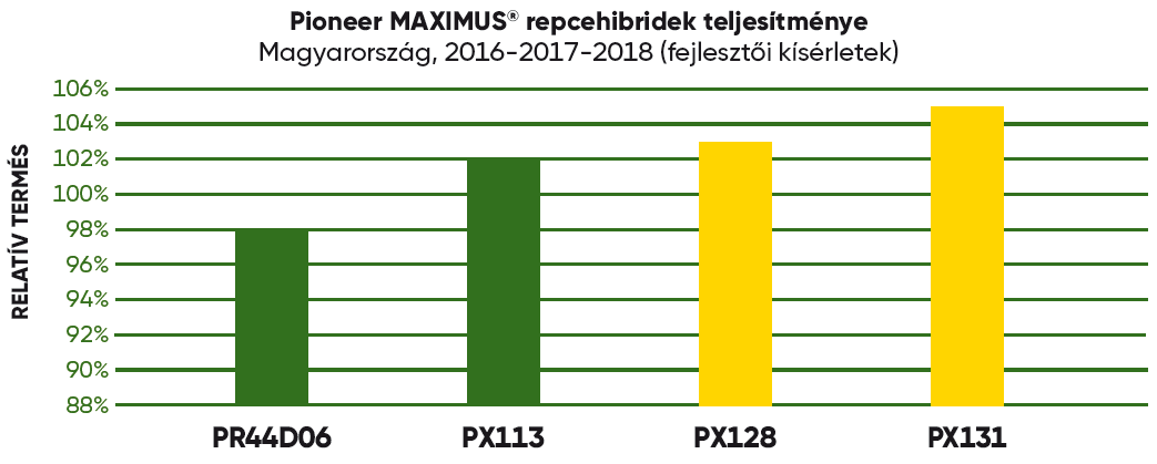 A kukorica és a napraforgó esetében megszoktuk és természetesnek vesszük, hogy minden évben új hibrideket vezetünk be. Az elmúlt tizenhárom év alatt sikerült letenni a névjegyünket a magyar repcepiacon is, mára a Pioneer® hibridek a magyar repcepiac meghatározó szereplői. Nem meglepő tehát, ha az előttünk álló repcevetésekhez három új, kimagasló teljesítményű hibriddel jelentkezünk. Két Pioneer MAXIMUS® hibriddel és egy hagyományos, magas hibriddel.
