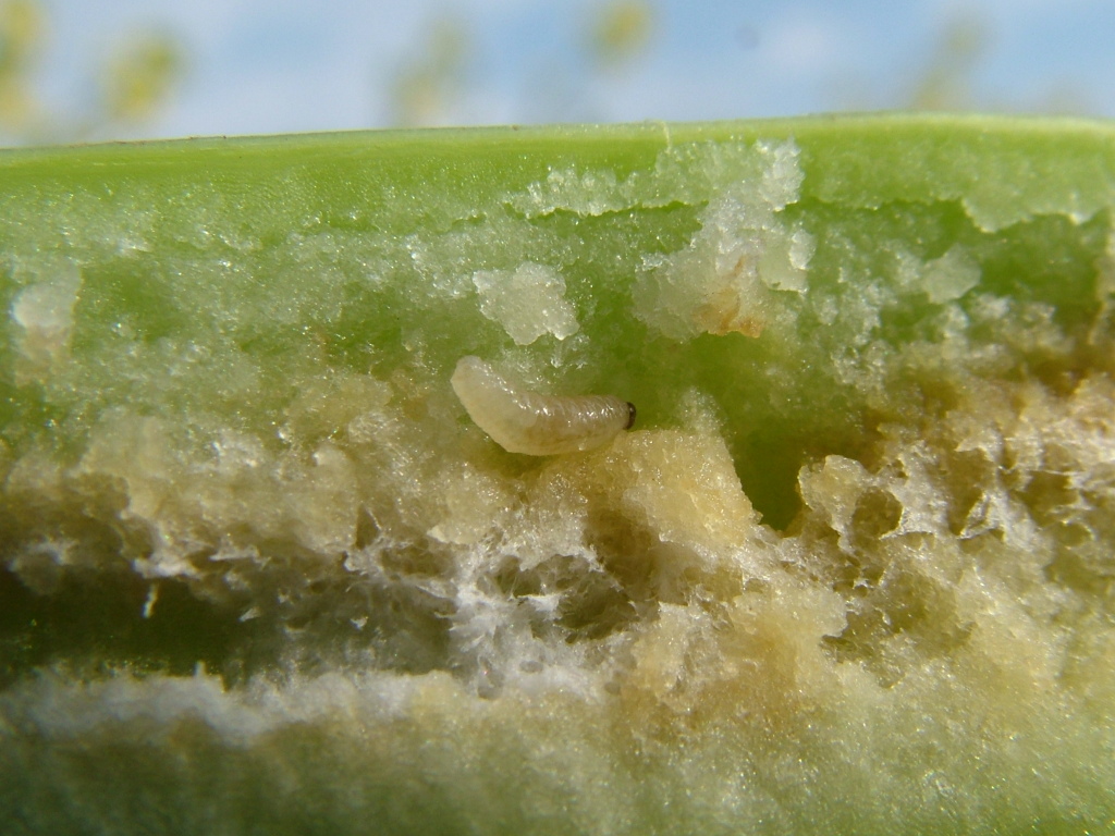 Szárormányos bogár lárvájának kártétele szárban.