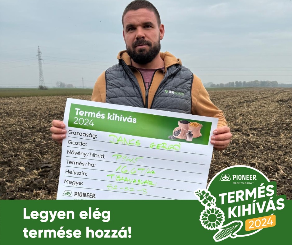 Dancs Gergő, a Szabolcs-Szatmár-Bereg vármegyei Tiszavasváriban található Dancs-Farm Kft. tulajdonosa, aki a 2024-es Termés Kihíváson a legmagasabb kukoricatermést érte el, 16,6 t/ha-os terméseredményéről így nyilatkozott: „Azért esett a P9415 hibridre a választásom, mert régóta használok siló és szemes Pioneer® hibrideket nagy megelégedéssel, és most szerettem volna egy rövidebb tenyészidejű hibridet is kipróbálni. A termesztés során talajforgatásos technológiát alkalmazunk, a tápanyag utánpótláskor nem csak műtrágyát, hanem szerves trágyát is kijuttatunk, valamint a növényvédelemre is teljes odafigyelést fordítunk. Azért vettünk részt a kihívásban, mert már a kezdeti fejlődési szakaszban is láttuk, hogy milyen kiemelkedő a P9415 hibrid teljesítménye, amit a 16,6 t/ha terméseredmény is bizonyít.”