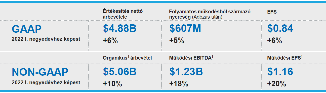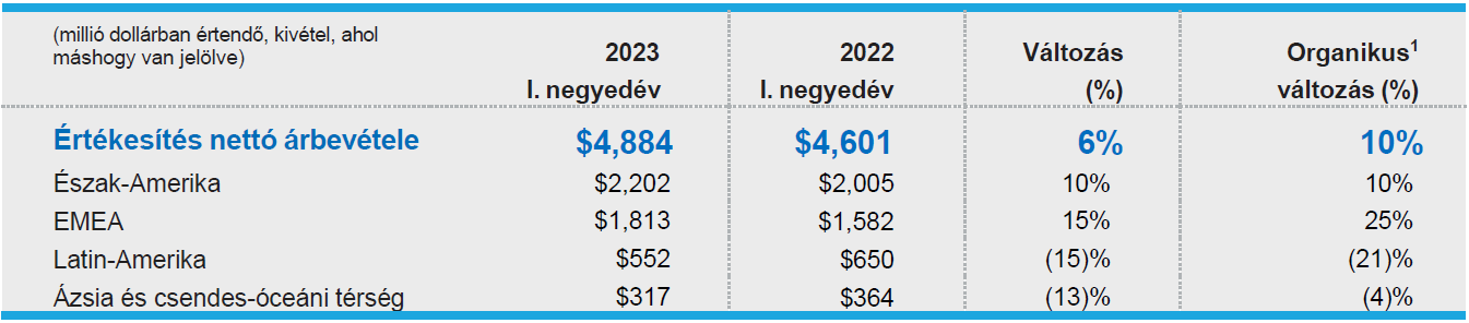A szegmens működési EBITDA értéke 603 millió dollár volt 2023 első negyedévében, ami 23%-kal magasabb, mint 2022 első negyedévében. Az árvégrehajtás, a termelékenységi intézkedések és a kedvező kombináció több mint ellensúlyozta a magasabb ráfordítási költségeket, beleértve a nyersanyagköltségeket, valamint a kedvezőtlen árfolyamhatást. A szegmens működési EBITDA- aránya több mint 390 bázisponttal javult az előző év azonos időszakához képest.