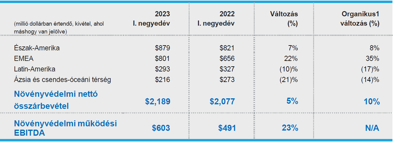 A növényvédelmi üzletág nettó árbevétele 2023 első negyedévében megközelítőleg 2,2 milliárd dollár volt, szemben a 2022 első negyedévi megközelítőleg 2,1 milliárd dollárral. Az árbevétel növekedését a 11%-os árnövekedés okozta, amelyet részben ellensúlyozott az 5%-os kedvezőtlen árfolyamhatás és az 1%-os volumencsökkenés, beleértve a termék kivonások hatását is.
