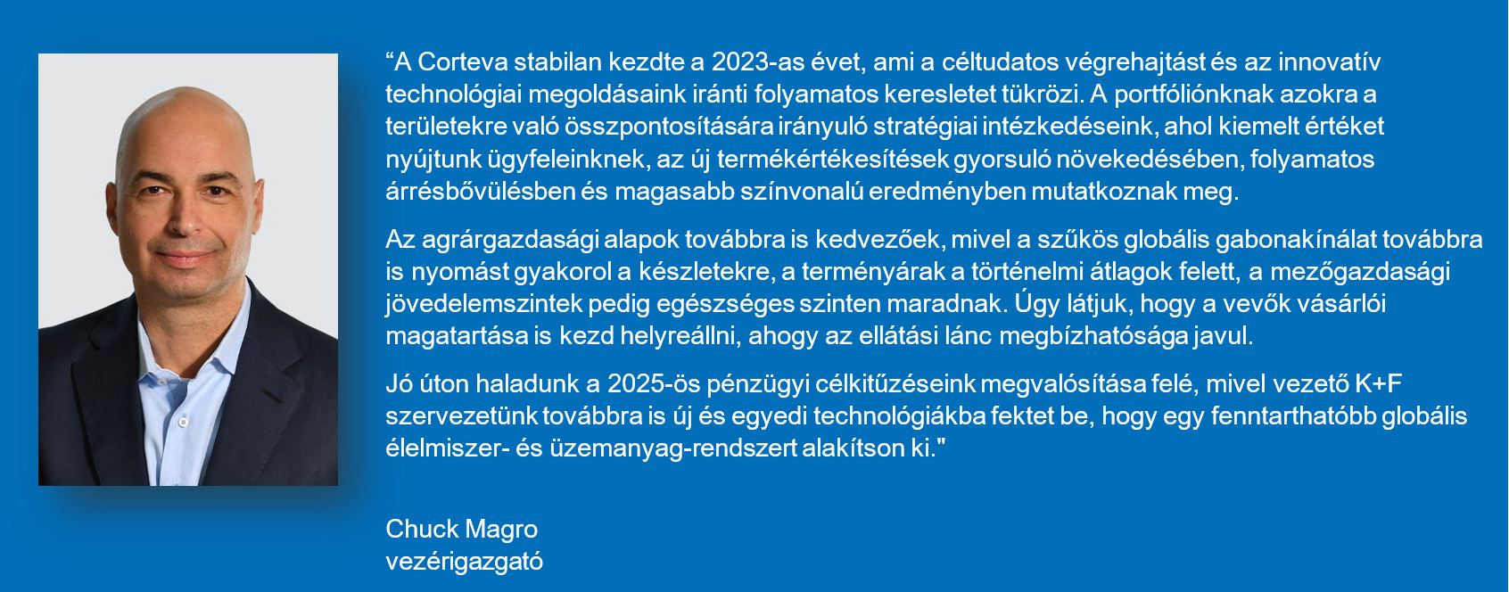 INDIANAPOLIS, Indiana, Amerikai Egyesült Államok, 2023. május 3. – A Corteva, Inc. (NYSE: CTVA) ("Corteva" vagy a " vállalat") beszámolt a 2023. március 31-én véget ért három hónapra vonatkozó pénzügyi eredményeiről.