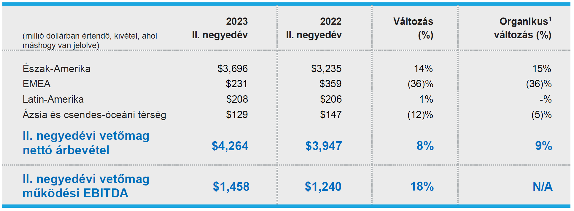 A vetőmagok nettó árbevétele 2023 második negyedévében 4,3 milliárd dollár volt, szemben a 2022 második negyedévi mintegy 3,9 milliárd dollárral. Az árbevétel növekedését a 12%-os árnövekedés és a portfólió 1%-os kedvező hatása okozta, amit részben ellensúlyozott a 3%-os volumencsökkenés és a 2%-os kedvezőtlen árfolyamhatás.