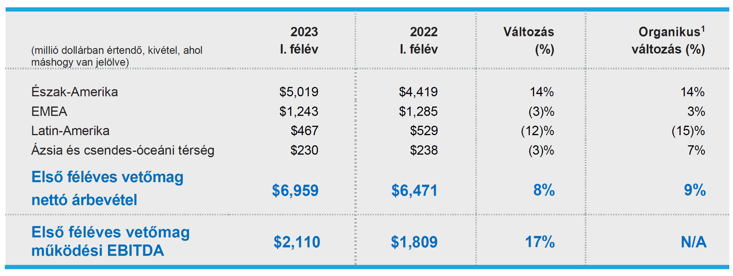 Az áremelkedést a csúcstechnológiás termékek iránti erős kereslet és az erős operatív végrehajtás okozta, mivel a kukorica és a szójabab világpiaci ára 14%-kal, illetve 8%-kal emelkedett. Az alacsonyabb volumeneket az EMEA térségben a kukorica vetésterületének csökkenése, Észak-Amerikában a szója vetésterületének csökkenése, valamint az Oroszországból való 2022-es kivonulásról szóló döntés okozta, amit részben ellensúlyozott az Észak-Amerikában megnövekedett kukorica vetésterület. A kedvezőtlen árfolyamhatásokat a kanadai dollár és a török líra okozta.