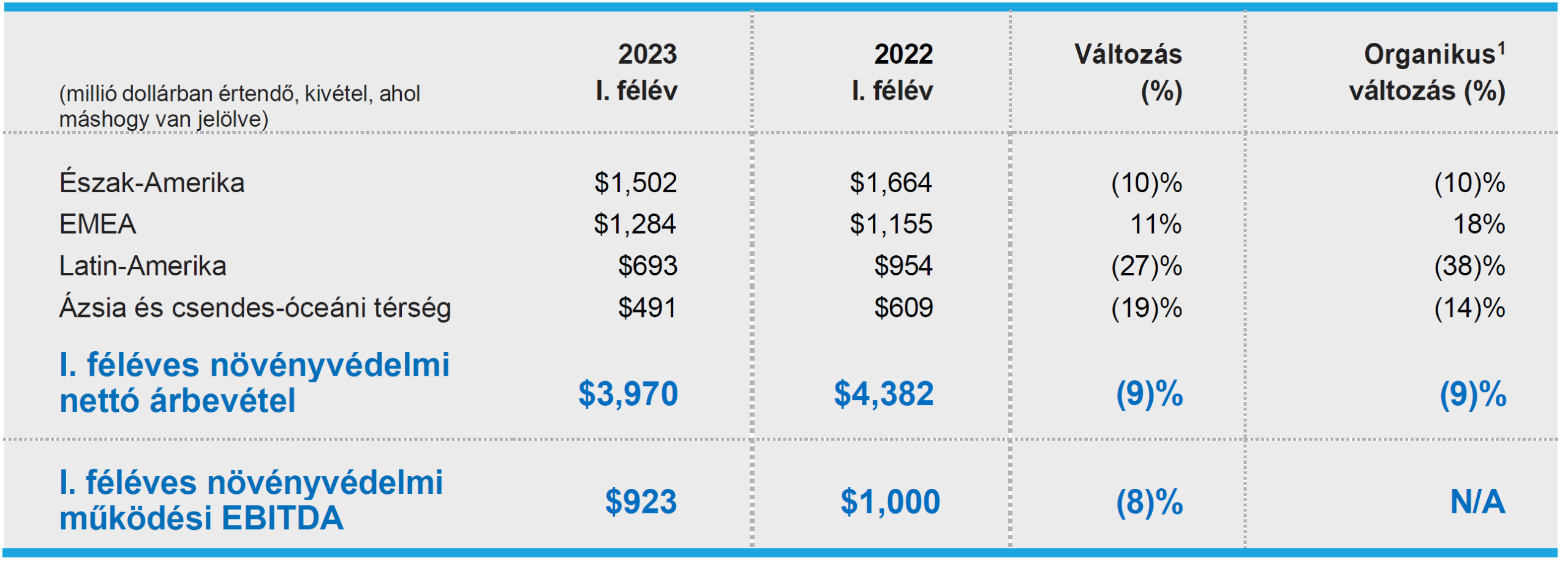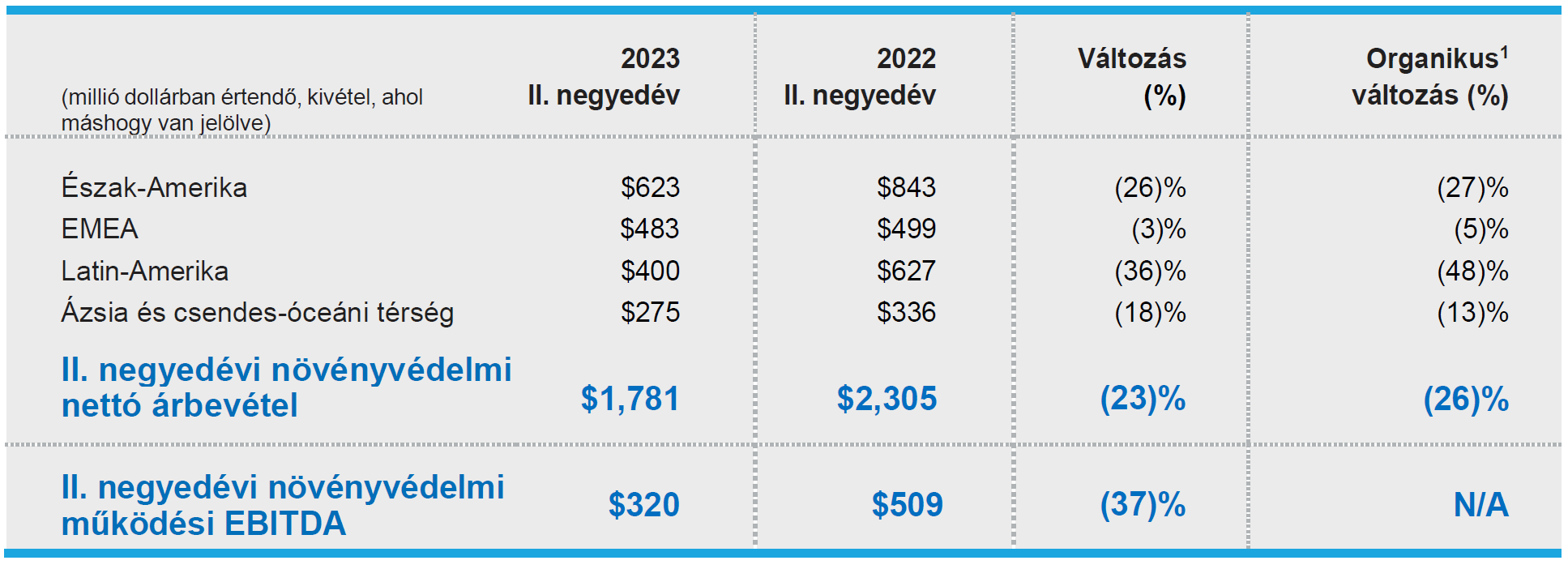 A növényvédelmi üzletág nettó árbevétele 2023 első félévében megközelítőleg 4,0 milliárd dollár volt, szemben a 2022 első félévi megközelítőleg 4,4 milliárd dollárral. Az árbevétel csökkenését a volumen 16%-os csökkenése és az árfolyam 3%-os kedvezőtlen hatása okozta. Ezeket a csökkenéseket részben ellensúlyozta a 7%-os árnövekedés és a 3%-os kedvező portfólióhatás.
